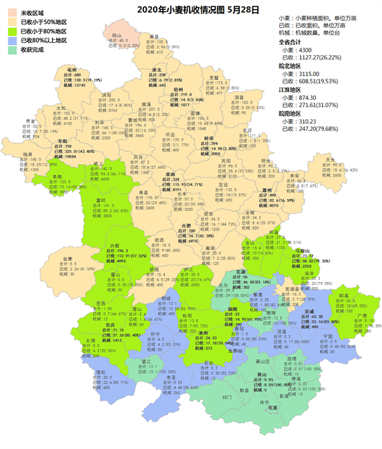 截至5月28日17时,全省已收获小麦1127.3万亩,进度为26.2%,比去年同期进度快17.4个百分点。当日收割358.2万亩,投入联合收割机7.1万台。其中六安112.9万亩,进度为57.5%;阜阳325.5万亩,进度为43.4%;合肥76.1万亩,进度为42.3%;淮南115.9万亩,进度为34.7%;亳州130.5万亩,进度为19.2%;滁州82.6万亩,进度为16.6%;蚌埠15万亩,进度为3.8%;淮北6.8万亩,进度为2.8%;宿州14.8万亩,进度为2.1%。