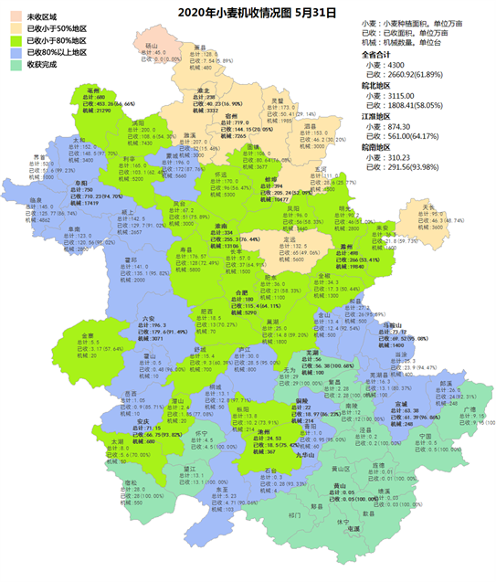 截至5月31日17时,全省已收获小麦2660.9万亩,进度为61.9%,当日收割560.3万亩,投入联合收割机10.4万台。其中阜阳710.2万亩,进度为94.7%;六安179.6万亩,进度为91.5%;淮南255.3万亩,进度为76.4%;亳州453.3万亩,进度为66.7%;合肥115.4万亩,进度为64.1%;滁州266万亩,进度为53.4%;蚌埠205.2万亩,进度为52.1%;宿州144.2万亩,进度为20.1%;淮北40.2万亩,进度为16.9%。