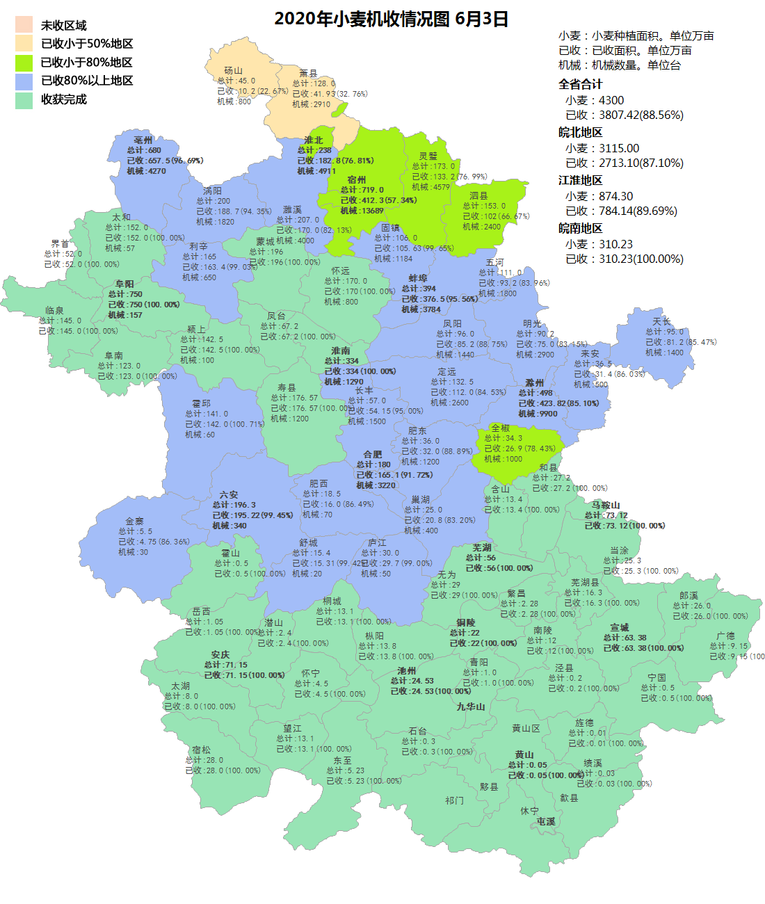 截至6月3日17时,全省已收获小麦3807.4万亩,进度为88.6%,当日收割261.4万亩,投入联合收割机4.2万台。其中阜阳、淮南两市小麦抢收任务全面完成;亳州、蚌埠、六安三市基本完成;合肥165.1万亩,进度91.7%;滁州423.82万亩,进度85.1%;淮北182.8万亩,进度76.8%;宿州412.3万亩,进度57.3%。